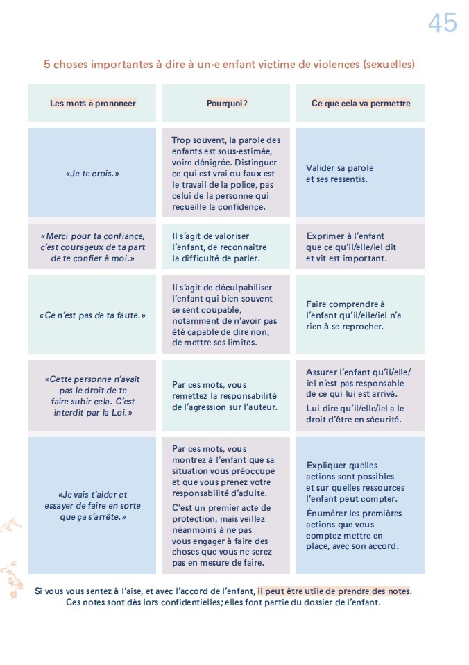 - Apporter des balises aux professionnel·le·s pour mieux les préparer à réagir de manière adéquate lors de révélations de violences sexuelles faites sur mineur.es.